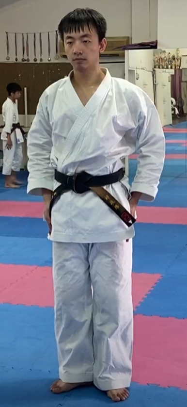 抬頭挺胸,目視正前方,雙手掌緊貼大腿兩側,雙腳併攏,腳掌向外張開45°。