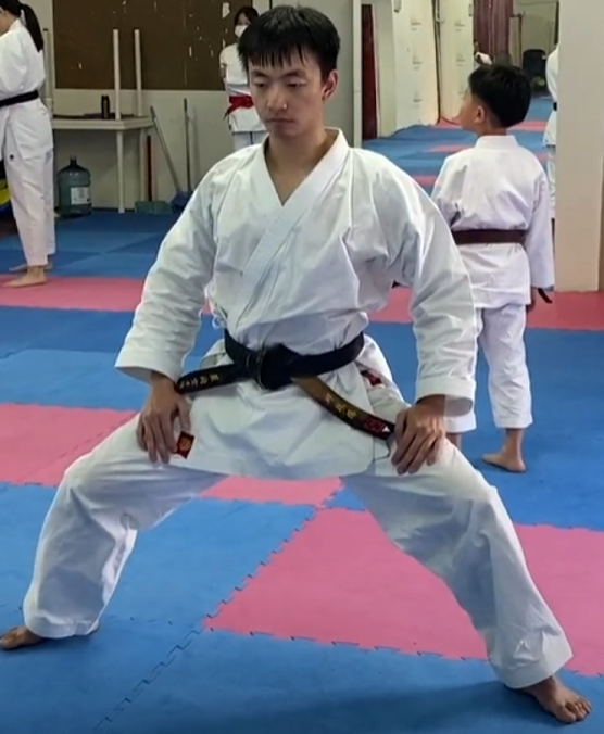 1.抬頭挺胸,目視正前方,身驅保持正面,雙腳與肩同寬,蹲下時,後腳膝蓋與前腳腳跟相距兩個拳頭的寬度,原地站起即為兩腳標準距離。