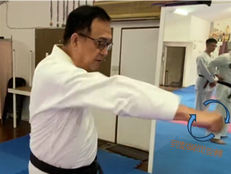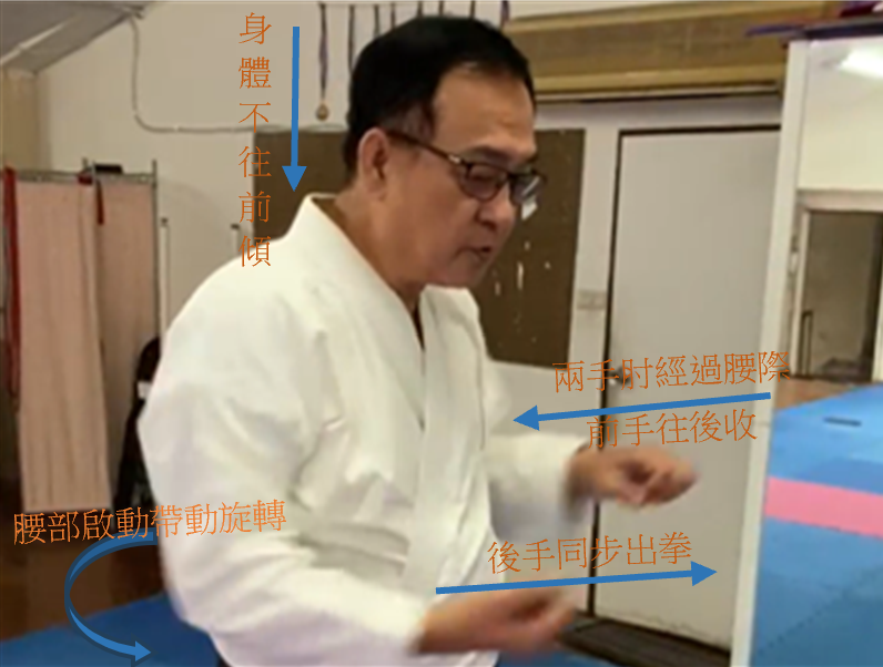 3. 扭腰的同時,另一手同步收拳時提供的反作用力。