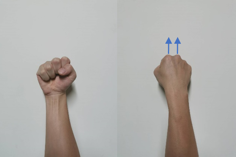 4. 直擊時,從食指開始至小指依序發力內扣,最後大拇指扣緊食指,這是因為從食指開始發力可以最快啟動拳心旋轉,同時也是因為正拳攻擊依靠的是食指與中指指根關節接觸目標。若以中指、無名指、小指攻擊的話,手腕在接觸目標時會有較大幅度的彎曲,很可能扭傷手腕。